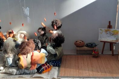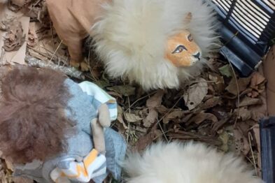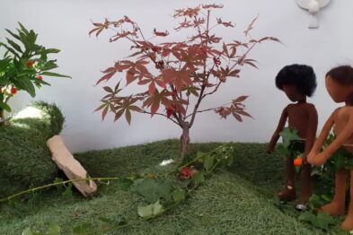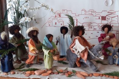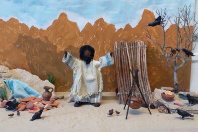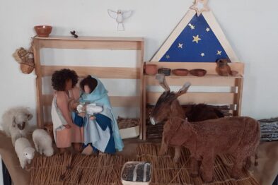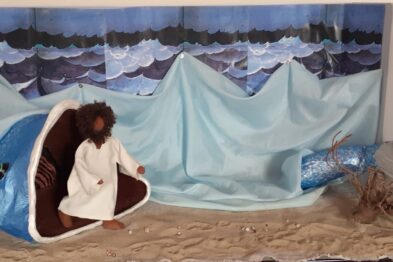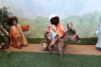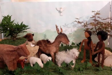 C’est une porte d’entrée ludique et une approche attirante pour les enfants. Il s’agit de mettre en scène des petits personnages (de 30cm) et donc des animaux – tous fait main – dans un décor illustrant le passage biblique choisi.